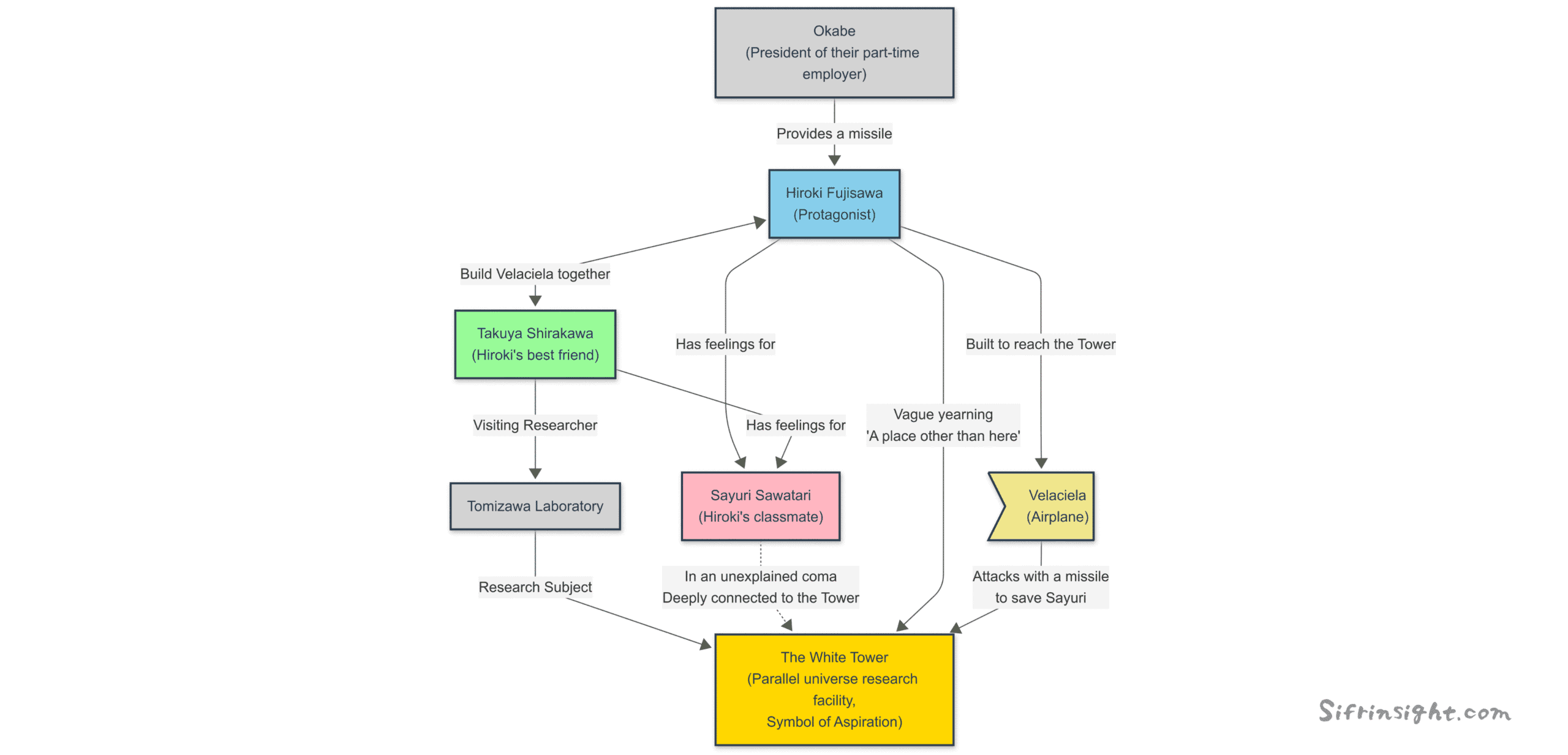 A summary of the film is: “Middle school students Hiroki, Takuya, and Sayuri dream of reaching the white tower in Ezo, but Sayuri suddenly disappears. Years later, learning she is in a coma, Hiroki and Takuya destroy the tower to save her. However, her memories of Hiroki are lost.” We provide a more detailed synopsis and a character map. - A “Story of Loss” That Subverts the Structure of Roman Holiday